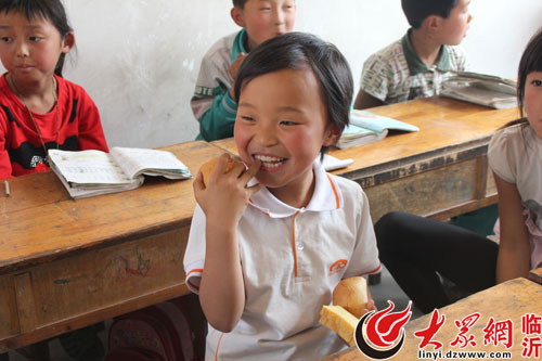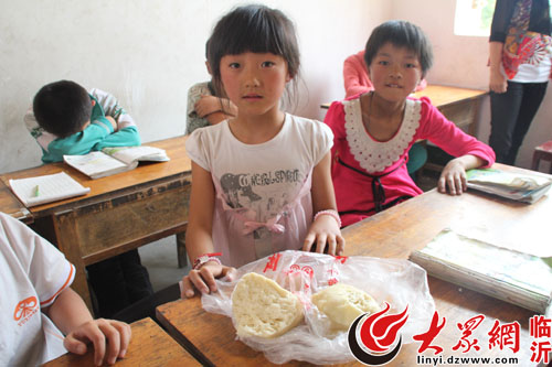 中午11:30,到了孩子们吃饭的时间,一个馒头、一个煎饼就是孩子们的午餐,二年级的周琪琪同学告诉记者,同学们家都住的很远,中午只能在学校里吃饭,一般情况下,同学们只带一些自己家的馒头、煎饼,学校的老师会给孩子们烧一些水,没有菜就只有喝着水吃馒头了。五洲医院给孩子们带来的面包竟成为了孩子们的“奢侈品”。看着孩子们吃着面包时满足的笑容,在场的人再一次被感动。