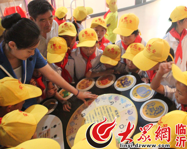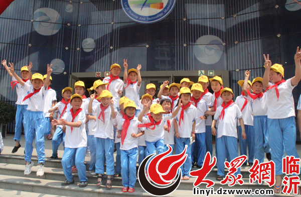 沂水沙沟镇小崮头小学35名孩子在临沂科技馆楼前高喊着"临沂我来啦!"