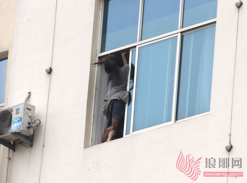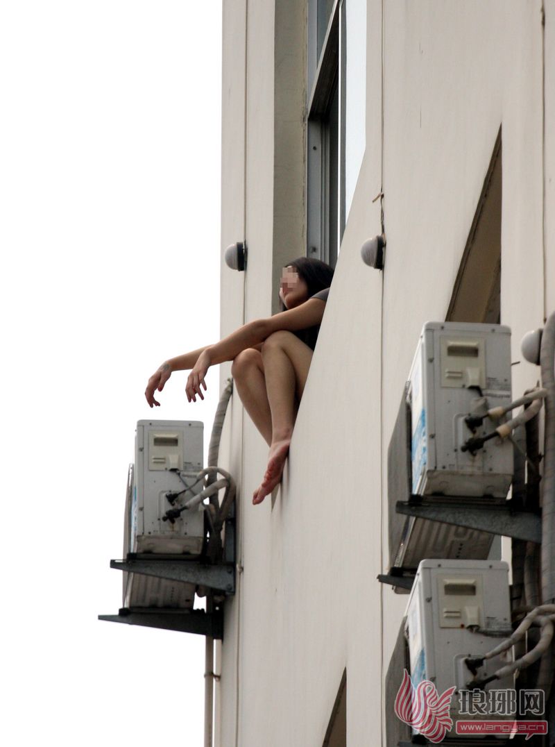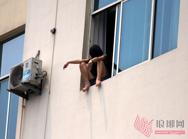 女子身体前倾,蹲坐在窗台,稍有不慎,就有掉落的可能。