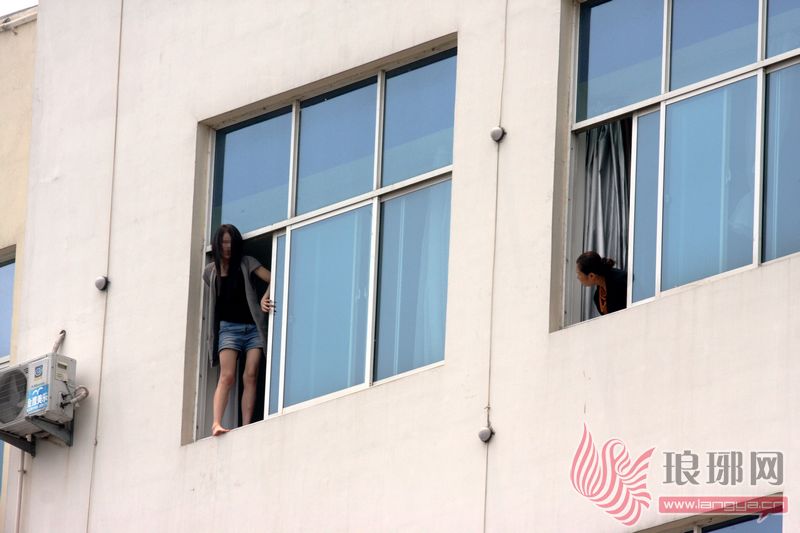 “有人在蒙山大道附近宾馆准备跳楼!”3日上午10点,记者接到市民报料后,赶到事发现场。事发地点位于蒙山大道与前十街交会南100米路西的一家快捷宾馆,一名20岁左右、身着短裤的女子蹲坐在5楼的一间客房窗台上,双腿及双手伸在窗外,身体前倾,稍有不慎,就可能从窗台掉落。