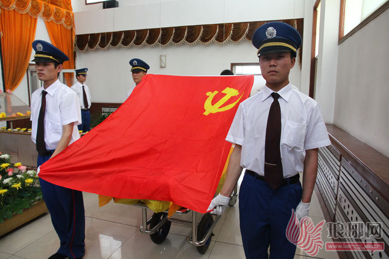 在6月4日的遗体告别仪式上,工作人员为英雄李学国覆上党旗