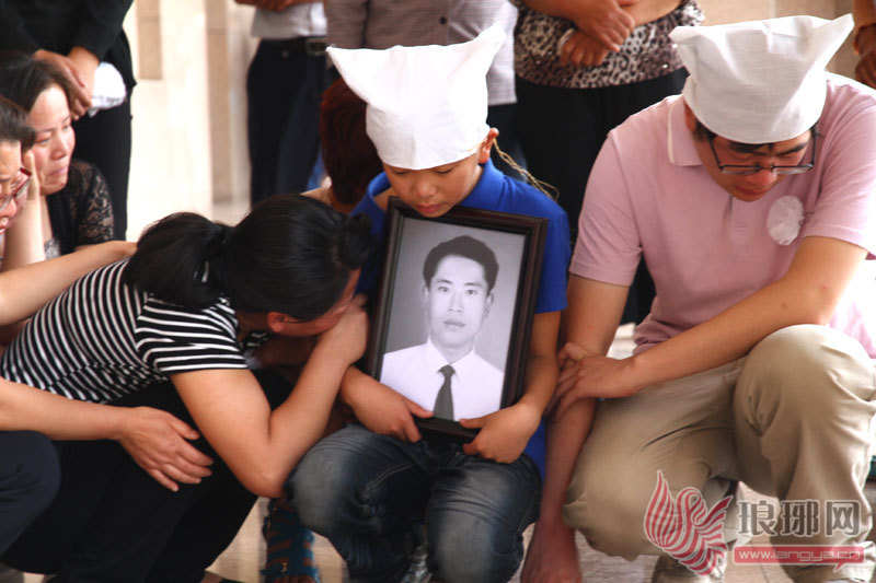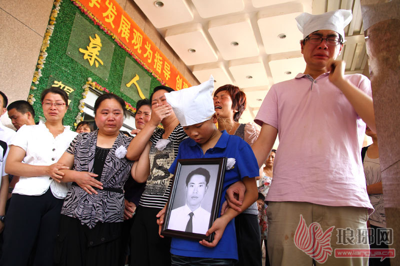 李学国家人抱着他的遗照等待遗体。