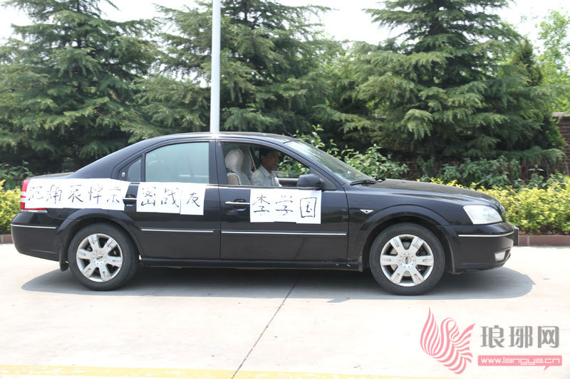 曹金良的车上贴着“沉痛哀悼亲密战友李学国”几个大字。