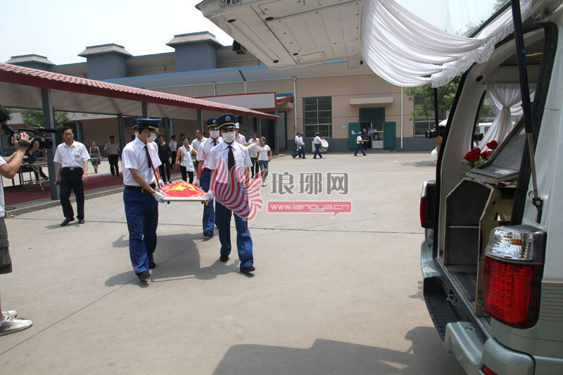 李学国的骨灰被抬上灵车。