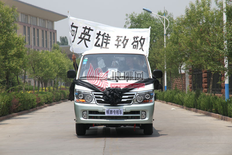 载李学国遗体的灵车挂起标有“向英雄致敬”字样的横幅。