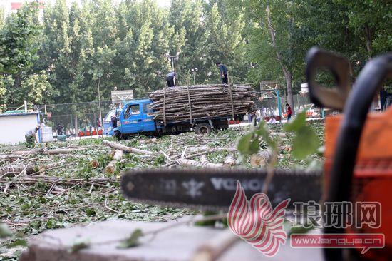 记者接到报料后,赶到了市青少年宫,看到在大约300平方米的范围内,有大量的树木被伐倒,地面上横七竖八地都是被锯断的杨树主干,树干直径大多在30厘米左右。倒下的树均是从根部被锯断,截面平整。部分已伐倒的树木有的已经被分解成两三米一截。一名工人正手持电锯站在伐倒的树木当中,分解一些较粗大的树干,伴随着电锯轰隆隆的刺耳巨响,一棵十多米高的大树转眼就被分成了几截。