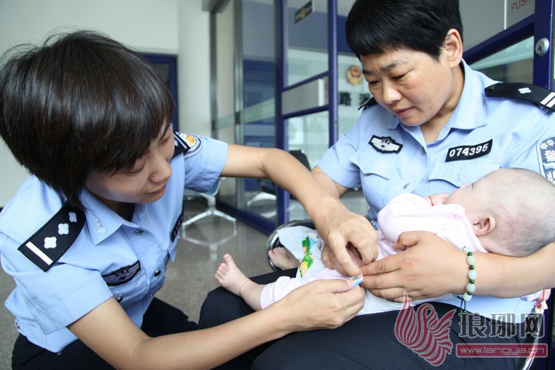 民警为孩子换纸尿裤。