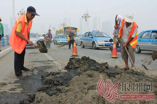 6月2日,金雀山路沂河大桥上被大量从施工车遗洒的污泥污染,造成路面交通拥堵,临沂市园林局滨河景区小埠东管理所立即组织人员进行清理,确保了道路畅通。