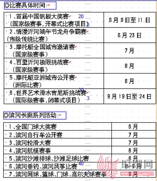 作为一项高品位滨水体育运动综合节会,首届中国沂河文化体育旅游节将以多种滨水运动赛事项目为主要依托,同时坚持体育、文化、旅游项目互动,按照每月都有高水平赛事,每周都有体验活动,逐步推进,渐次升温,9月份与园博会双节合璧。