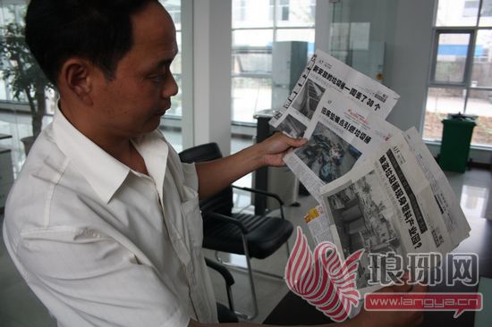 许传金向记者展示他收集的本报关于垃圾桶遭窃、烧毁的相关报道。