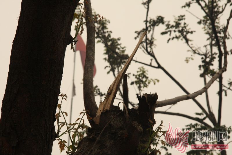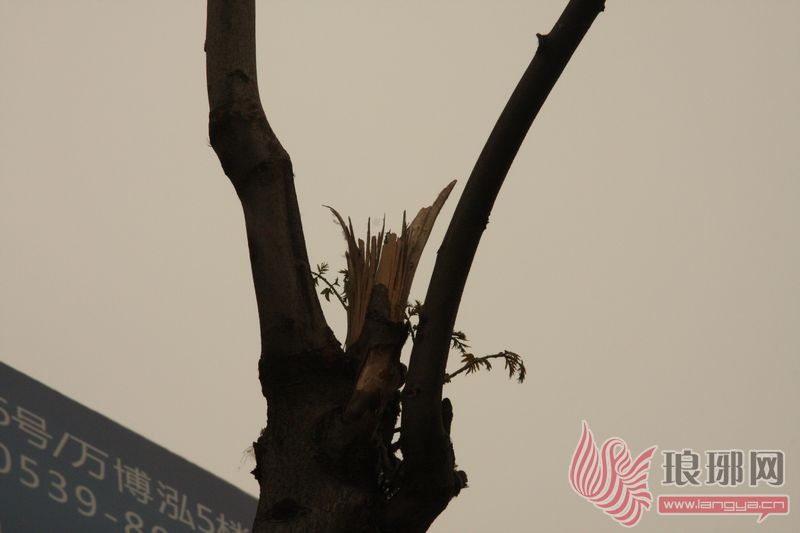 随后,记者进行了一番调查。在市区洗砚池街与通达路交会处往南通达路东侧,记者发现原本葱郁的绿化树有的被砍光枝杈,有的被掰断树枝,就连一棵小树也难逃厄运,活生生被砍去了半边,树上还能清楚地看到新砍伐的痕迹。另外,胜利小学附近的几棵行道树也遭受了同样的命运。