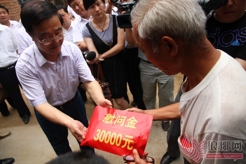 李荣强代表市见义勇为基金会送上慰问金。