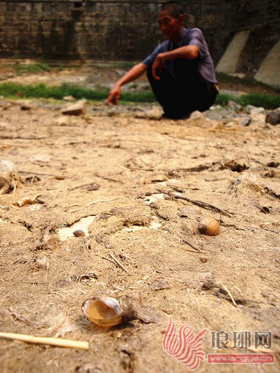 饮虎泉蓄水池已经干涸,池底随处可见螺蛳壳。