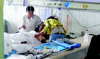 14日下午,记者在临沂市人民医院南院见到了被撞的张大妈,她还处于昏迷状态。据家人介绍,张大妈伤势比较严重,仅右臂就骨折三处,大腿多处骨折,头部也有淤血。