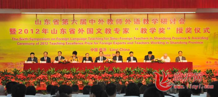 临沂网讯 6月17日,山东省第六届中外教师外语教学研讨会暨2012年外国文教专家“教学奖”颁奖仪式在临沂大学隆重举行。国家外国专家局文教司司长赵立宪、山东省教育厅总督学孟庆旭、山东省人民政府外事办公室副主任封燕文、山东省外国专家局局长刘杰;临沂大学党委书记丁凤云,临沂市副市长边峰,临沂大学校长韩延明等出席。