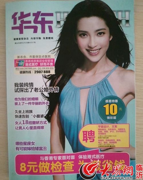 记者看到帖子中附带的“杂志”的照片,“杂志”是临沂华东医院的内刊,当红影星李冰冰为封面,封面上还标注了“冀出内准字(2010)第AS057号”,看上去颇为专业。但“杂志”既没有出版社名称,也没有出版刊号、工商管理部门核准的广告经营登记证号等信息。
