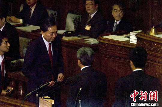 6月2日下午,菅直人内阁不信任案在国会众议院表决结果遭否决。在国会召开前一个小时,民主党召开了党代议士会,菅直人在会上表明自己将在结束东日本大地震的灾后重建应对后辞职。图为否决后感谢议员的菅直人。孙冉摄