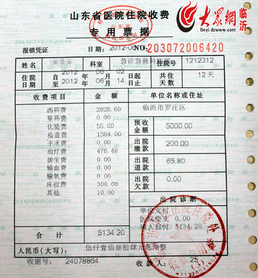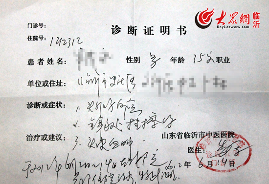 在由朱先生为本网提供的诊断证明上,诊断或症状处标着如下字样:1、头疼反应;2、全身多处挫擦伤;3、头皮血肿,落款处盖着临沂市中医医院的印章。“当时从现场与打人的交警一起去了市场派出所做了笔录,当时派出所的民警让回家等消息。因为身上有伤,我便去了临沂市中医医院,从那天起便住院治疗,一直到14日才出院。”朱先生说。