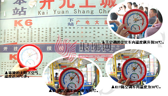 6月21日13点24分,记者在开元上城站牌处实地测温,温度计上显示地表温度为38℃,赤日炎炎,等车的乘客都躲在树荫下,不一会就有种火辣辣的灼热感。几分钟后,记者首先乘坐了一辆没有空调的36路公交车,一上车就有种闷热的感觉,虽然司机师傅头顶上有个风扇在呼呼啦啦地吹着,但他还是把衣服撩起了一半,试图用这种方式降温。