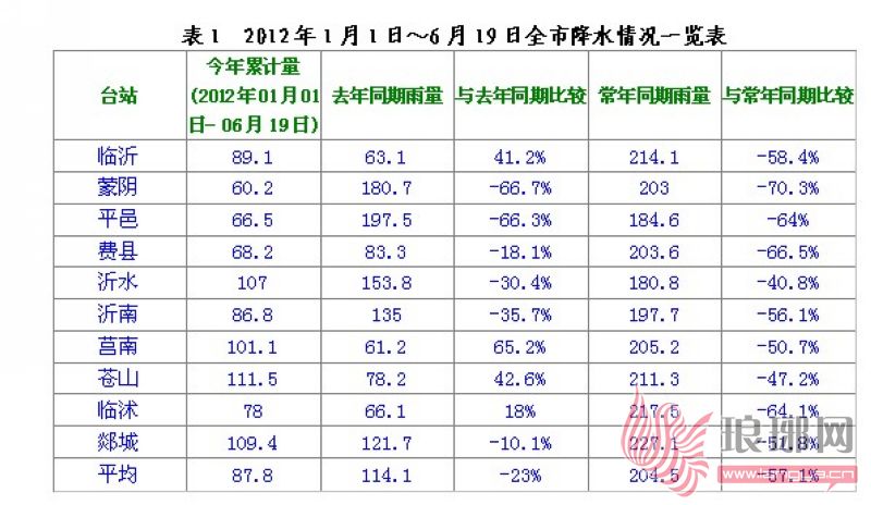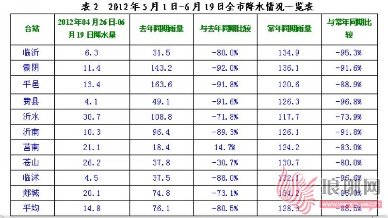 据临沂市气象部门对比分析,2012年1月1日至6月19日,全市平均降水量为87.8毫米,较常年同期(204.5毫米)偏少57.1%(表1),较去年同期(114.1毫米)偏少23.0%。尤其是自4月26日以来,全市57天基本无普遍有效降水,多为局地雷雨或阵雨天气,旱情持续发展。4月26日~6月19日,全市平均降水量为14.8毫米,较常年同期(128.3毫米)偏少88.5%(表2),较去年同期(76.1毫米)偏少80.5%。