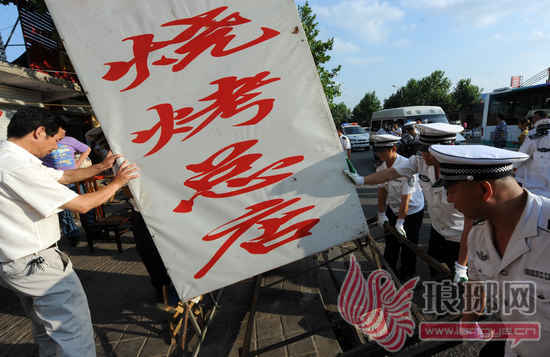 在24日下午的执法过程中,大部分烧烤经营摊点都积极主动的配合,将占道的广告牌、炉具、桌椅等搬到规定的区域内。记者从城管部门了解到,对于烧烤问题,我市按照规范和取缔相结合,以规范为主的原则,对城区露天烧烤进行了集中治理。重点整治二级、三级路段,规范摊点经营。对于主要路段道路两侧,严禁经营露天烧烤。次要路段晚上7点之前,不准占道经营。