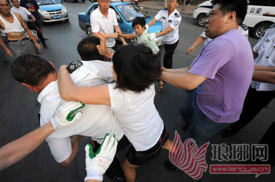 该烧烤店店员在街头上演的这场闹剧并未就此收场,在看到执法人员即将把烤炉抬上车时,恼羞成怒的店主从一旁抄起马扎砸向了执法人员头部,幸亏执法人员躲闪及时,仅仅砸中了胳膊,见袭击没有成功,男子又挥舞着拳头打向执法人员。迫不得已,几名执法人员只能将这名男子控制住,而刚刚那名女子见状则扑到一名执法人员身上撕扯,另外几名店员也冲上前来推搡执法人员,执法人员赶紧将他们进行了隔离,并迅速撤离现场,才使这场闹剧得以收场。