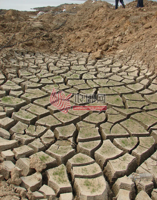 由于天气干旱,凌山头水库的部分库底已经干涸。