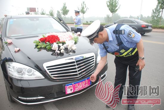 同时,交警提醒婚车司机,驾驶婚车应该遵守交通法律法规,不要给喜庆的婚礼添堵,可以把带有“百年好合”“白头到老”字样的祝福联贴放在牌照上面的引擎盖上或后备箱盖上。