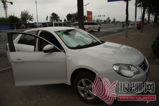 一辆银色POIO车的右前窗被砸。