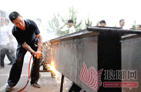 图为联合执法队将收缴的烧烤炉进行切割销毁。 摄影 记者袁文潇