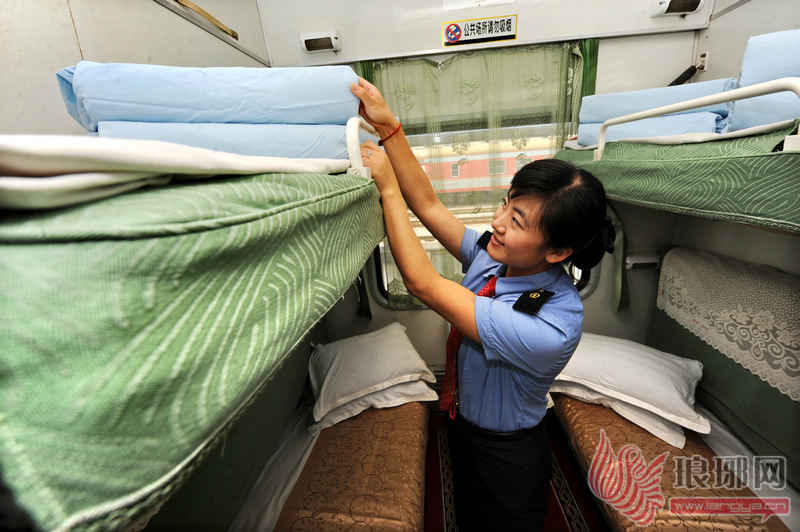 登上车厢,记者见到乘务人员早已各就各位。记者了解到,本趟列车共分15节,其中硬座车厢6节,硬卧车厢6节,软卧车厢1节,还有1节餐厅车厢,车上的座套等物品都是新的。