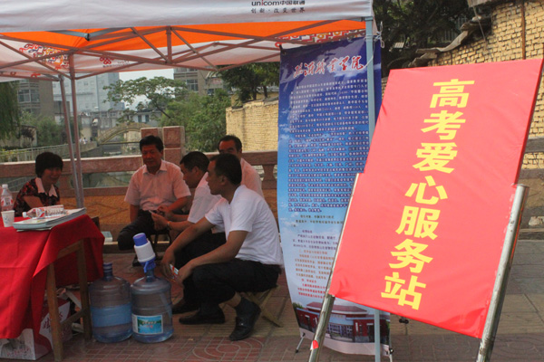 高考首日,多个高考爱心服务站设在了各大考点。在九中考点,记者从临沂市正直驾校付传亮队长了解,爱心服务站为考生、家长提供矿泉水、太阳帽、休息椅子,甚至还为家长提供了休闲娱乐的扑克牌。据了解,市区每个考点的爱心服务站分配4人,高考期间早上5:30到6:00开始。驾校领导重视爱心高考服务活动,每天来视察2次,在高考的前三天就召开会议,部署安排活动具体事务,为学生的高考贡献一份力量。