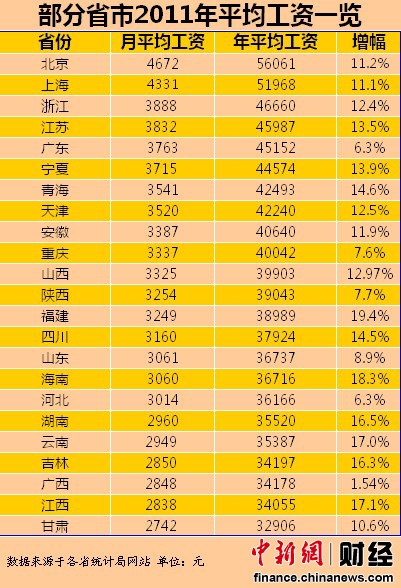 中新网7月6日电(财经频道 李金磊)中新网财经频道统计发现,目前全国已有北京等23个省区公布了2011年城镇单位在岗职工平均工资。数据显示,在这23省区中,北京职工月平均工资最高,为4672元/月,其次是上海,为4331元/月,而排名垫底的是甘肃,仅为2742元/月。