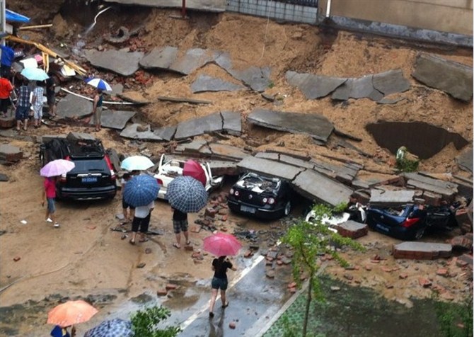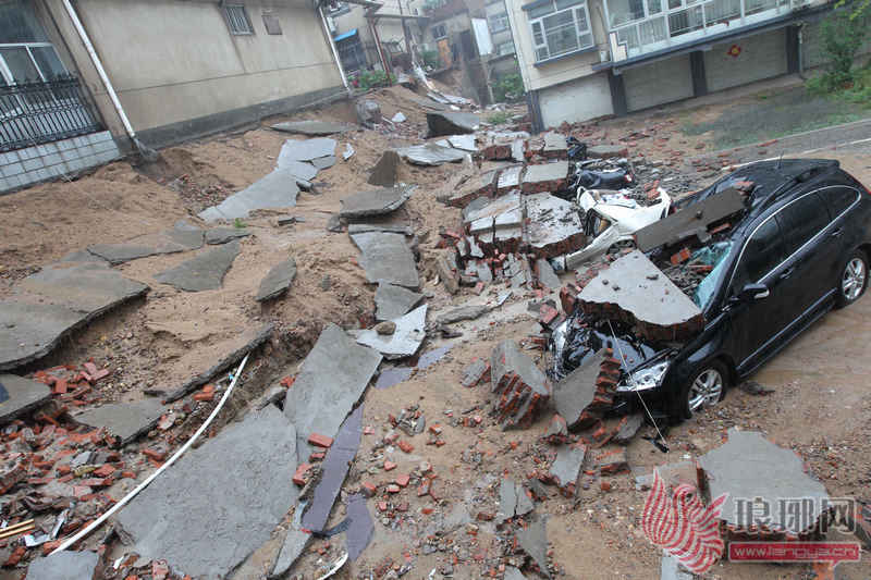 8日早晨8点,记者来到平安花园小区,小区许多居民正围在现场。由于平安花园和金山小区在地势上高低相差较大,两个小区之间一道50多米长的墙倒塌后将8辆车砸毁,有的轿车被厚重的砖墙直接砸扁后掩埋,只有3辆轿车还露出半个车身,但发动机部位也受损严重。院墙倒塌后,位于山坡上的大量黄沙也涌了下来,坡上的棚子也被冲了下来,整个现场一片狼藉,如山体滑坡一般。
