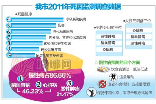 据市疾控中心慢病防制科科长杨柳青介绍,从死亡率看,2011年我市人群的前三位死因依次是脑血管病、心脏病和恶性肿瘤,死亡率分别为141.29/10万、136.06/10万、128.78/10万;第四至十位死因依次为呼吸系统疾病,伤害,消化系统疾病,内分泌、营养和代谢疾病,传染病和寄生虫病,神经系统疾病,泌尿生殖系统疾病。