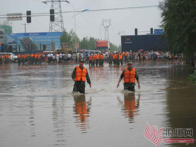 下午2时许,记者赶赴现场时,七八名泡在冰凉雨水中的武警官兵正缓慢拖着冲锋舟前行,冲锋舟里乘坐着五六名刚从楼上解救下来的村民,而武警官兵身后的工业园区珠峰路早已一片汪洋,自解放路一直向北蔓延1000余米。武警官兵放下这批群众后,立即跳上冲锋舟再次向工业园区内出发,解救其他被困群众。记者也迅速跳上冲锋舟与武警官兵一同深入园区了解灾情。
