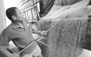 7月13日11点30分,临沂中慧蒙发饲料有限公司员工正在倾卸刚刚购进公司的小麦。