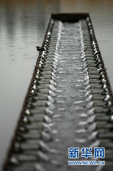 6月7日,一只鸟停留在杭州九溪自来水厂的沉淀区的装置上。环保部应急办现场督察指导组6月6日对新安江苯酚污染水域进行了现场勘查,最新监测结果分析,事发点新安江段、富春江、钱塘江苯酚浓度均呈下降趋势。目前杭州市主城区的自来水厂取水口水质达标,供水安全。记者走访了解到,杭州各大超市积极调运货源,以保障瓶装水的销售供应。新华社记者 黄宗治 摄