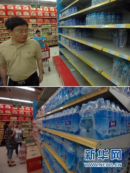上图:6月6日拍摄的杭州一家超市内的瓶装水货柜;下图:6月7日拍摄的杭州同一家超市内的瓶装水货柜供应充足(拼版照片)。新华社记者 黄宗治 摄