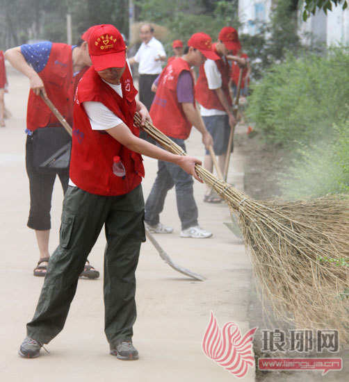 中国移动通信临沂分公司的志愿者在王家斜坊开展卫生清理服务活动。