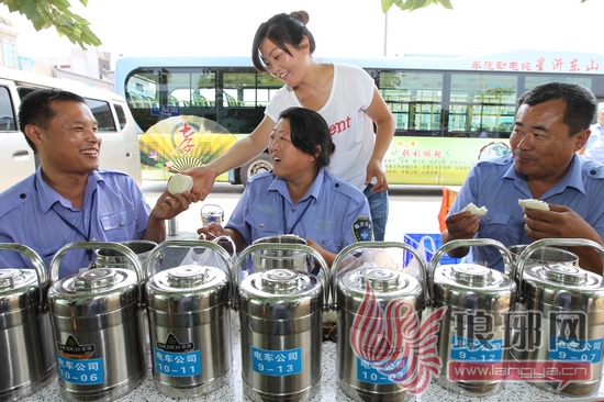 中午12点多,记者来到了临沂火车站,这里K9路、K10路、K11路的公交司们正围着桌子开心地吃着午饭。一位姓付的司机师傅说:“以前吃饭都是在路边买,既不卫生又不实惠。现在公司为我们送饭,还配备了保温桶和保温饭盒,饭菜不仅热乎可口,而且还代表了公司对我们的一份心意,感觉挺好的。”