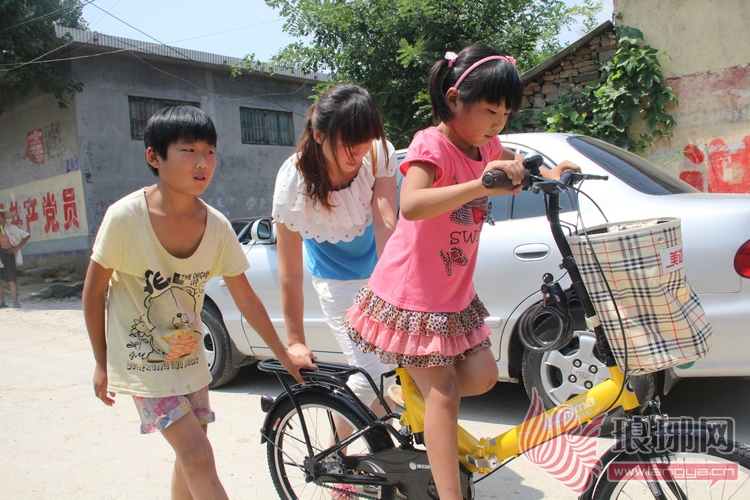 看到好心人又送来一辆自行车,姐妹俩急不可耐的就要骑上去试一试。