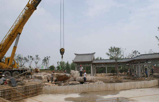 吊车吊起假山石,工人们仔细调整石头的方位。