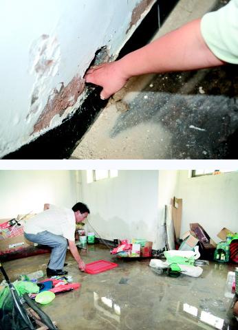 ▲一名居民家的地下室内还泡在水中。 ◥三年来,一条裂缝已经被水冲出了拳头大的洞。