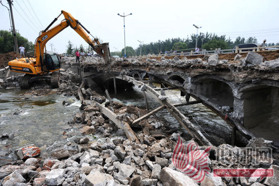 20日上午,罗庄区沂河路的陷泥河中,一台挖掘机正带动冲击钻,对跨越在河上的沂河路老桥进行拆除,随着水泥块的落下,桥体已露出了钢筋。罗庄区沂河路老桥始建于1978年,为木板结构。上世纪80年代中期紧贴桥南侧新建石拱桥。1998年在新建沂河路桥后,该桥废弃,但一直保存至今。今年7月8日、10日,市区连续发生两次强降雨后,沂河路老桥桥洞狭小,严重影响陷泥河的正常行洪。在随后启动的市区防汛排涝应急工程中,这座老桥也被确定为其中一项,负责实施该项目的罗庄区迅速行动,于7月19日开始实施拆除,预计于24日拆除完毕。