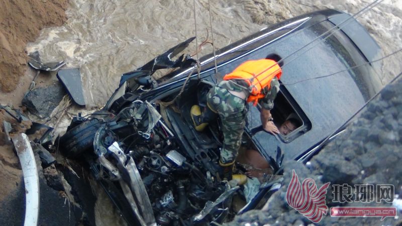 由于水流过急,岸边桥面不时发生塌方,极大地增加了救援难度。攻坚队员接近事故车辆后发现,奥迪车前部因碰撞已严重变形,司机腿部被挤在方向盘下无法动弹,所幸伤势不重。为增大救援操作空间,救援人员利用撬杠对车辆天窗实施破拆,并用安全带、救援绳对被困司机实施固定防护。在确定周边环境安全后,协同桥梁上方救援人员将被困司机营救上岸,并送往医院接受治疗。