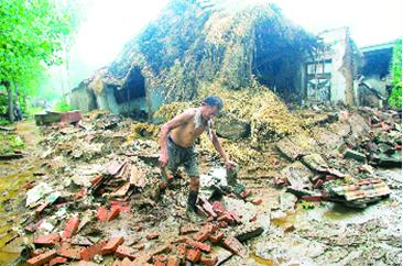 “不好,赶紧跑!”李良匆忙叫醒老伴,两人急急忙忙地跑到院子里。此时,院子里的积水已经到了李良的腰部。两人刚跑出门口不足10米,就听见背后传来“轰隆”一声,院墙塌了,紧接着,已经建了22年的土坯房房顶突然倒塌,4间房屋的北墙也轰然倒下。