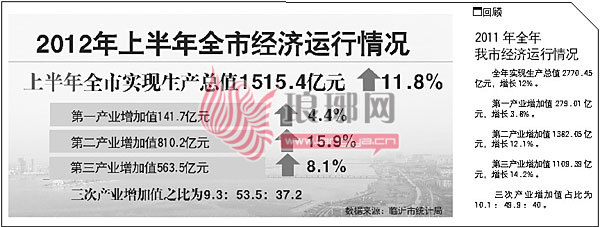 最新发布的2012年上半年全市经济运行情况传出捷报,今年以来,我市积极应对复杂严峻的国内外经济环境,努力克服各种不利因素对经济运行的影响,全力推进突破县域经济、统筹城乡发展、保障改善民生三项重点工作,经济运行继续平稳较快增长。上半年,全市实现生产总值1515.4亿元,增长11.8%,领跑全国4个百分点。各产业对比中,我市第二产业增加值增速与占比均居首位。