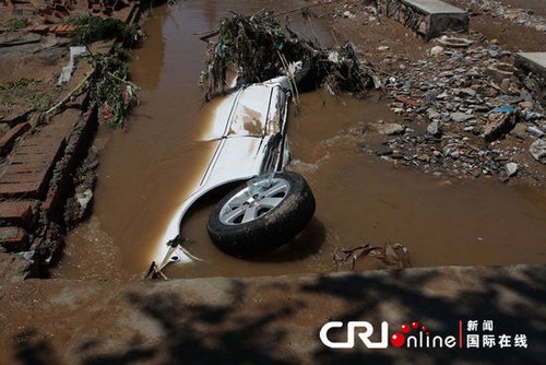 2012年7月22日中午,北京房山区北车营村泄洪渠内躺侧躺着一台白色轿车,几乎被泥沙掩埋。