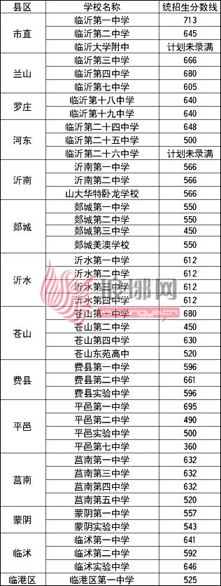 招生分数线显示,今年各高中学校的分数线较去年都有所上升。临沂一中以713分的高分位列榜首,市区临沂三中、临沂四中的分数线也分别达到666分和680分。在县区高中中,平邑一中以仅次于临沂一中的695分位列县区首位,平邑县的另一所中学平邑第七中学的分数线仅为360分,是全市所有公办高中中最低录取分数线。